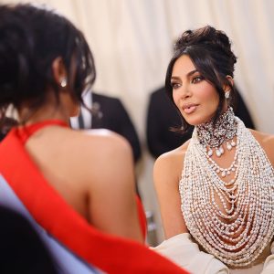 Kim Kardashian attends the Met Gala 2023 wearing only pearls and a corset