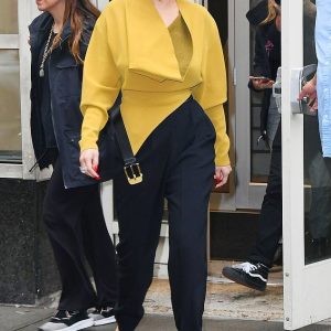 Selena Gomez looks business chic in unique mustard blazer with tailored trousers on press tour in New York