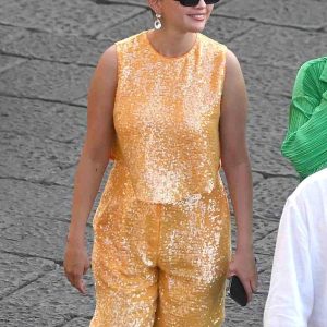 Selena Gomez turns heads in a tangerine sequinned co-ord as she steps out in Italy after vowing to embrace her ‘real’ stomach
