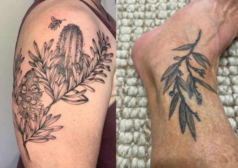 Lisa’s tattoo of Banksia marginata by Rosie Roo and Angela’s tattoo of native pepper (Tasmannia lanceolata) both celebrate plants found in Tasmania.(Supplied)