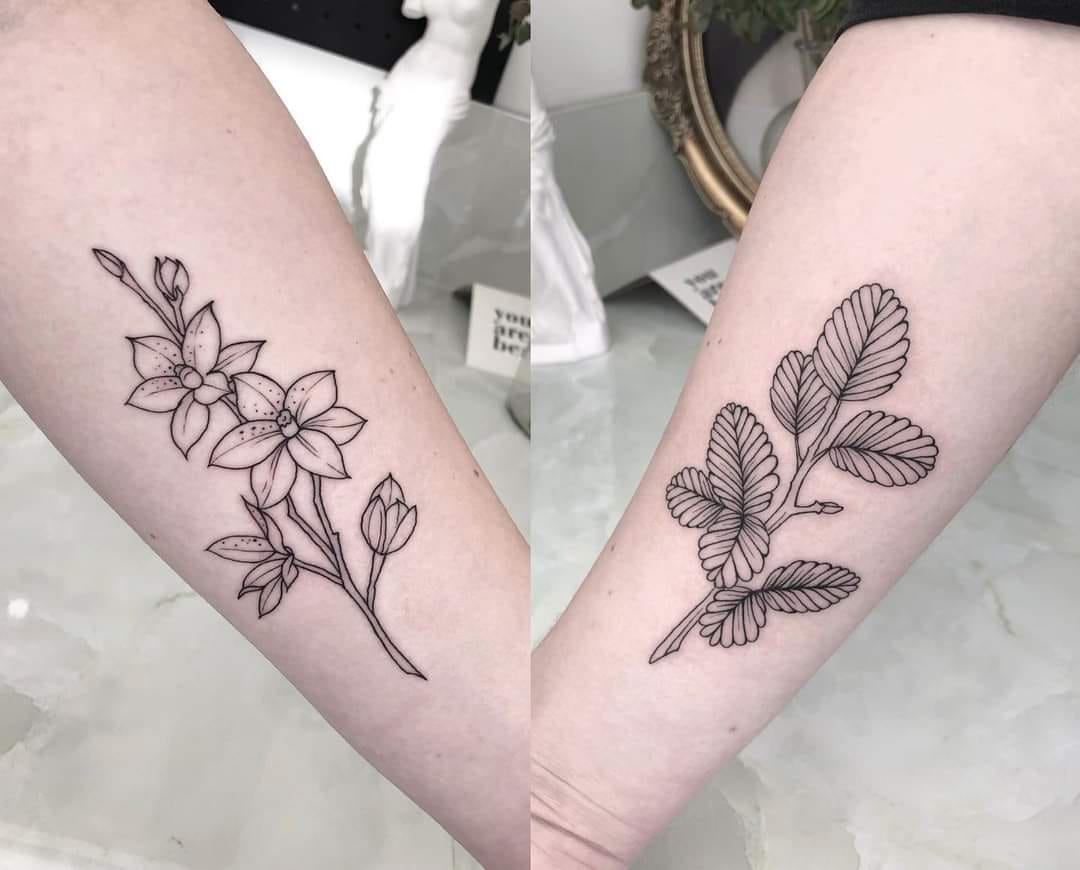 Bianca’s tattoos of a sun orchid flower and fagus leaves.(Supplied: Bianca)