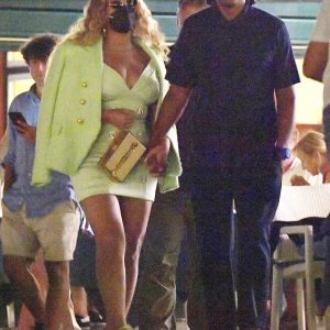 Beyonce wore a curve-hugging green mini dress as she held hands with husband Jay-Z at dinner with mother Tina Knowles in Portofino