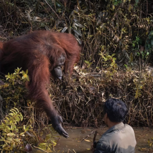 The Cuddly Orangutan Offers A Helping Hand To The Man Stuck In Mud