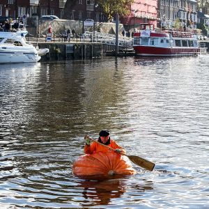 A gigantic pimped-out pumpkin has been paddled down the River Ouse today after an incredible carve. Tom Pearcy rowed across the water in a 1,364lb canoe created from a monster pumpkin….