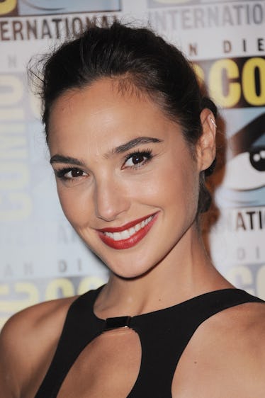 Keeping her hair in a braided up do with a light contour on the cheekbones and a coral red lip, Gadot attends the Entertainment Weekly: Women Who Kick Ass panel during Comic-Con International 2015.