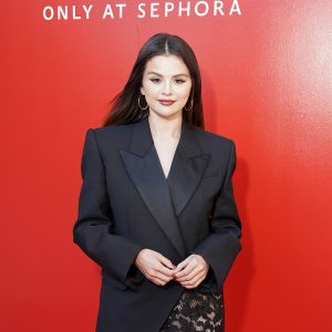 Selena Gomez looks every bit the makeup mogul in a spliced blazer dress and heels
