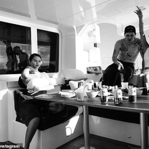Selena Gomez flaunts her cleavage and her flat stomach in patterned bikini while on boat with pals