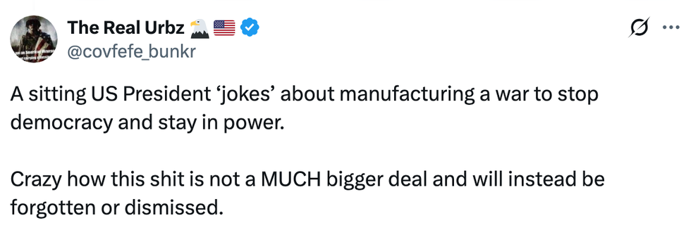 “A sitting US President ‘jokes’ about manufacturing a war to stop democracy and stay in power. Crazy how this shit is not a MUCH bigger deal and will instead be forgotten or dismissed,” one X (formerly Twitter) user wrote.