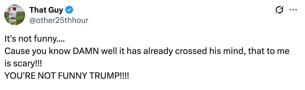 “It’s not funny…. Cause you know DAMN well it has already crossed his mind, that to me is scary!!! YOU’RE NOT FUNNY TRUMP!!!!”