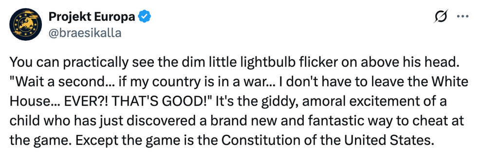 Another person said, “You can practically see the dim little lightbulb flicker on above his head. ‘Wait a second… if my country is in a war… I don’t have to leave the White House… EVER?! THAT’S GOOD!’ It’s the giddy, amoral excitement of a child who has just discovered a brand new and fantastic way to cheat at the game. Except the game is the Constitution of the United States.”