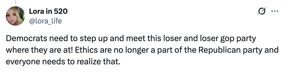 “Democrats need to step up and meet this loser and loser gop party where they are at! Ethics are no longer a part of the Republican party and everyone needs to realize that.”