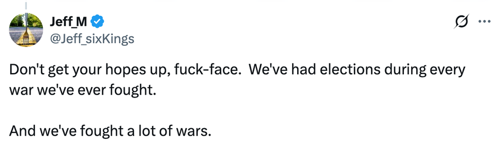 And finally, “Don’t get your hopes up, fuck-face. We’ve had elections during every war we’ve ever fought. And we’ve fought a lot of wars.”