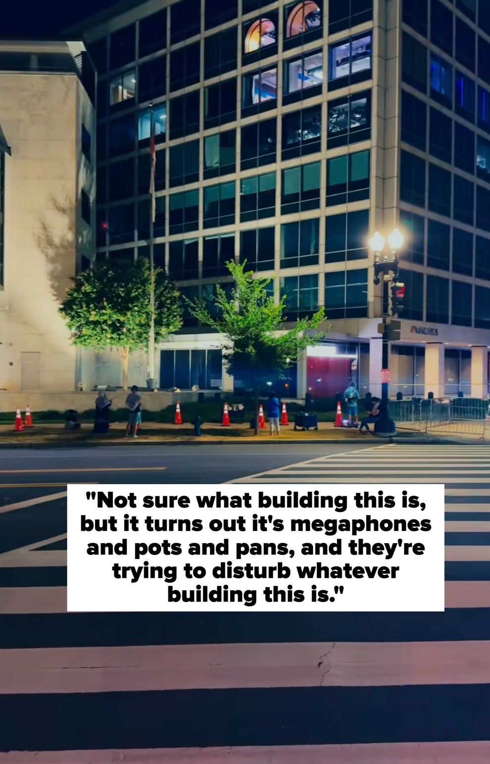 “Not sure what building this is, but it turns out it’s megaphones and pots and pans, and they’re trying to disturb whatever building this is,” he continued.