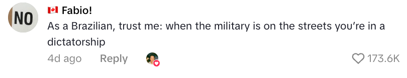 Rob said his goal was mostly to just report the facts of what was happening on his run, and let people come to their own conclusions after watching. But in the comments, people did not hold back their opinions. The majority were overwhelmingly shocked and scared by what Rob shared. “As a Brazilian, trust me: when the military is on the streets you’re in a dictatorship,” a top comment read.