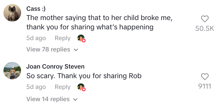 “Just to give you an example, a Black mother and her son [were] walking down the street,” Rob continued. “The second they turned the corner and saw the agents walking towards them, she immediately grabbed her son’s hand and told him, ‘When you see these people out here walking around, you’re gonna hold my hand, ’cause I want them to know that you’re mine and you’re not out here causing trouble. ‘Cause we don’t want any trouble with them.'”