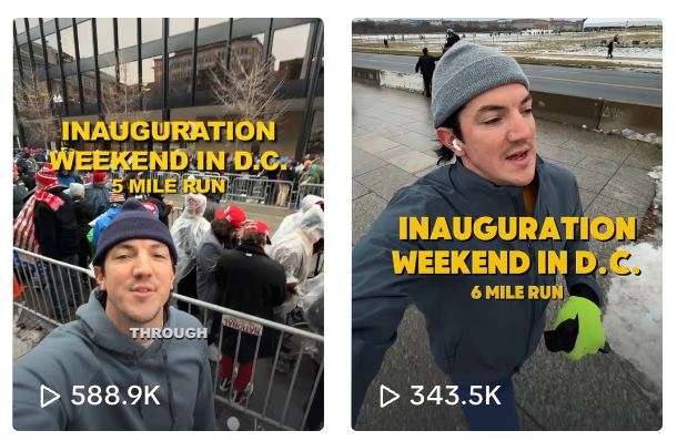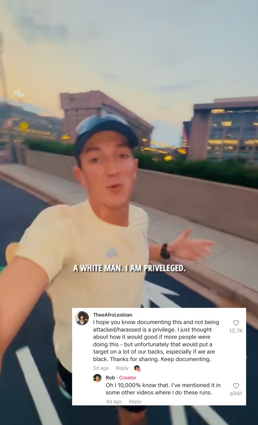 @r.oh.bee / Via tiktok.com He also shared that while he runs because it’s what he makes content about, it’s also the easiest and lowest risk for his own security. “It’s just me and a cellphone. No bicycle, no car, nothing. So I breeze past police and security around these types of events.”
