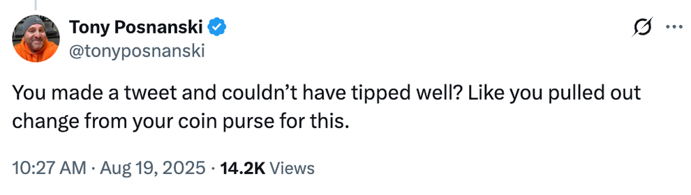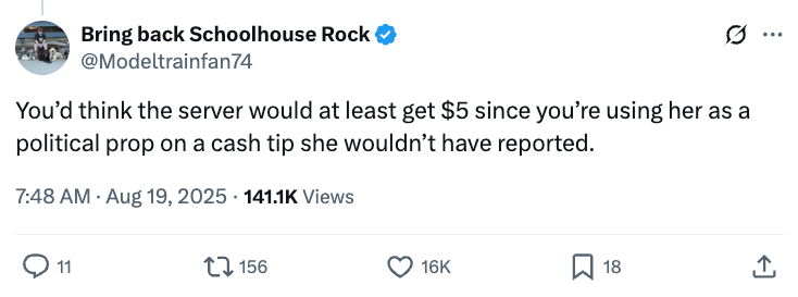 “You’d think the server would at least get $5 since you’re using her as a political prop on a cash tip she wouldn’t have reported,” one user replied on X, with another person commenting: “I’ve never seen someone brag so hard about being such a cheap asshole.”