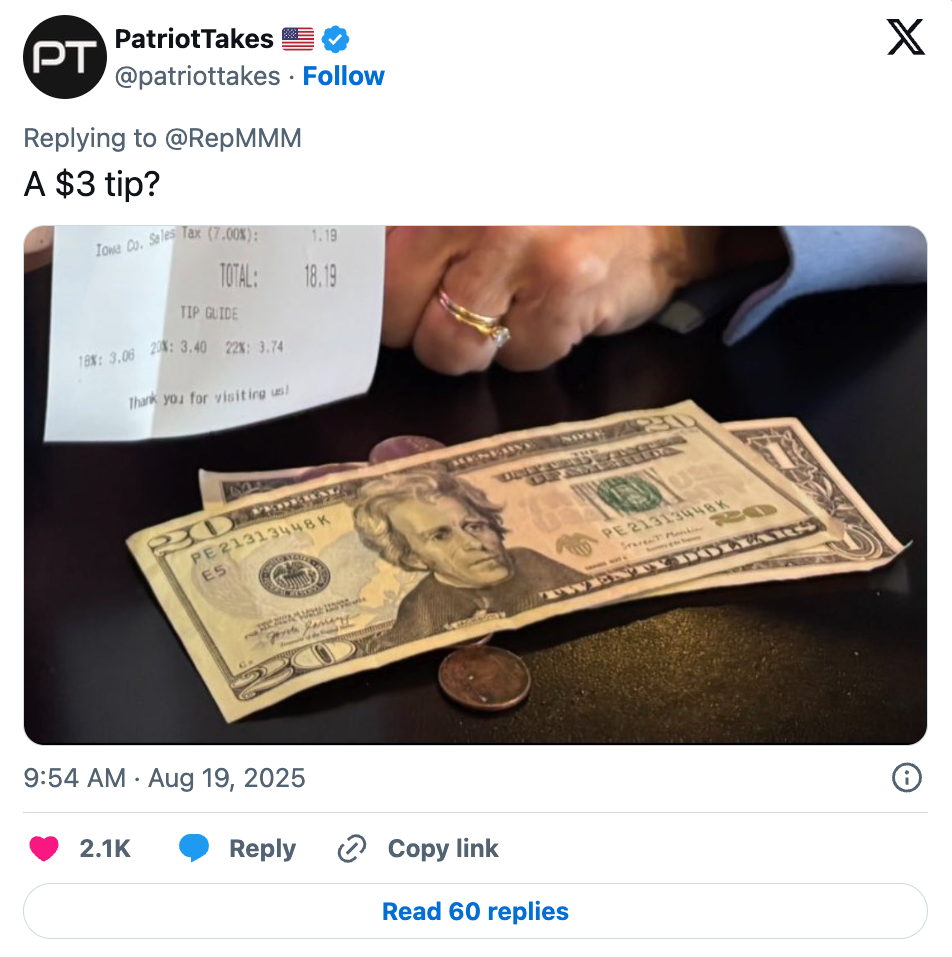 Social media users ultimately weren’t concerned with those details Monday, with many aghast that Miller-Meeks tried to champion her party by tipping “only” $3 on her lunch.