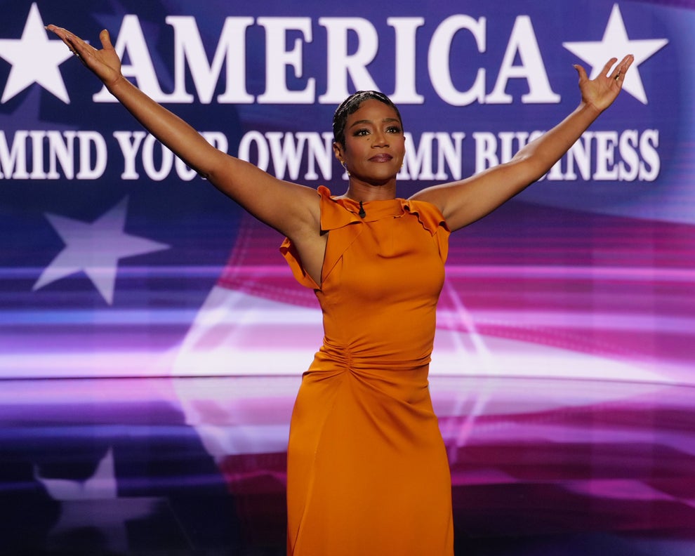 Jimmy Kimmel Live guest host Tiffany Haddish didn’t mention President Donald Trump during Monday night’s monologue, but she seemed to have him in mind as she jokingly announced she was running for president herself.